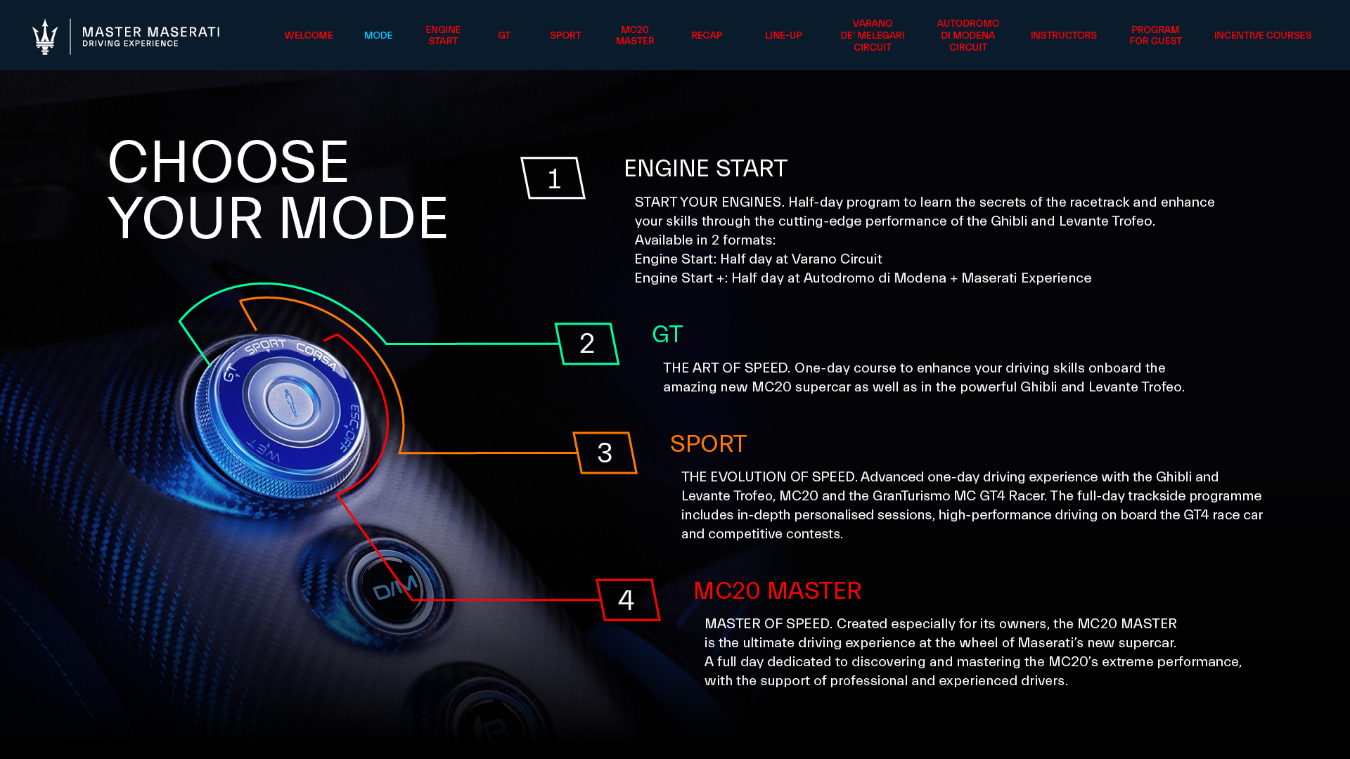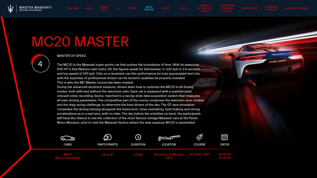 Entrate nell’abitacolo, impugnate il volante e preparatevi a superare i vostri limiti. Provate la sensazione di guidare le più potenti auto sportive Maserati nel loro habitat naturale: il circuito. Sapete che possono superare i 100 km/h in 3 secondi, ma ora tocca a voi padroneggiare l’arte della velocità. Raggiungete la massima accelerazione e aderenza dalla linea di partenza, dentro e fuori da ogni curva. Scoprite come deve essere la frenata da corsa e lasciate che i nostri professionisti vi insegnino tutti i segreti per diventare un vero Maserati Master.